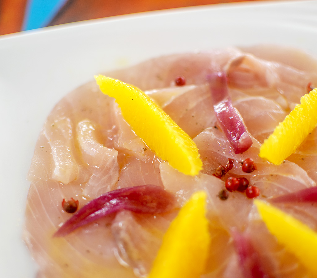 cubes of tuna served with orange peel, lime black pepper, smoked salt e extra virgin olive oil