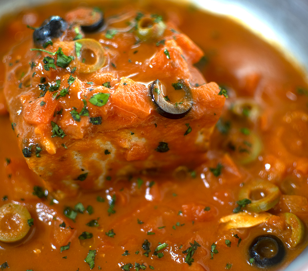fish steak cooked in tomato sauté, capers and olives