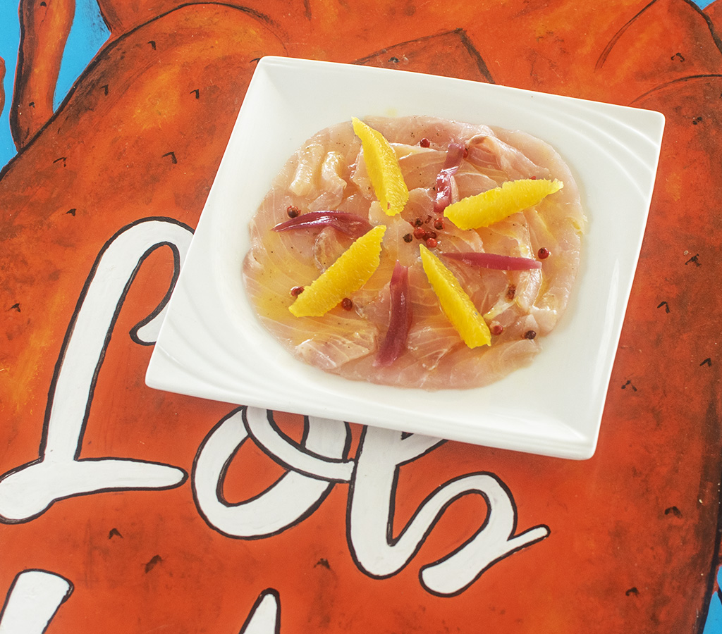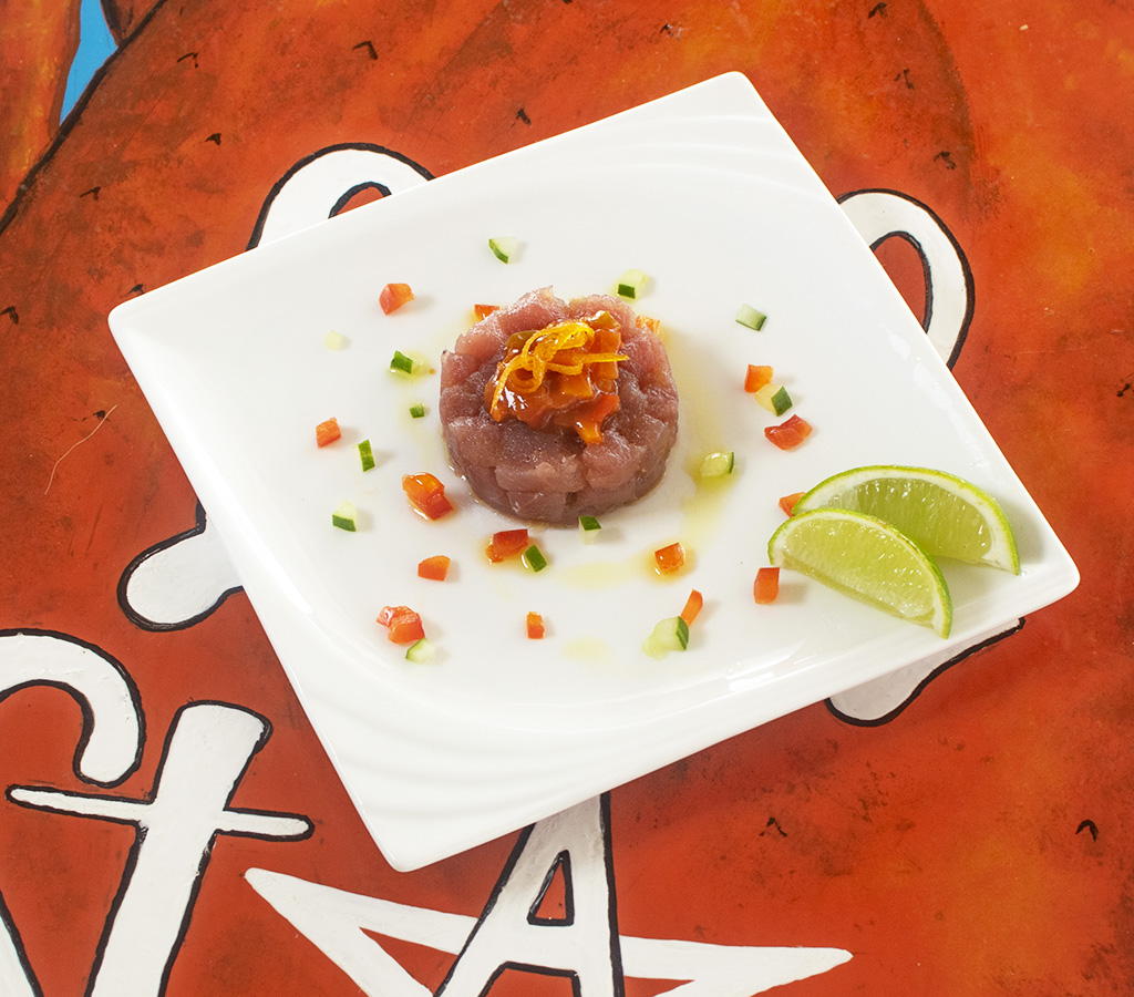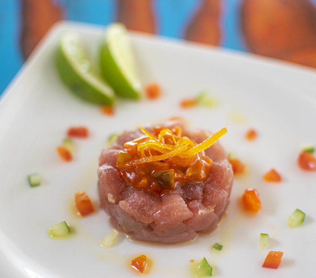 cubes of tuna served with orange peel, lime black pepper, smoked salt e extra virgin olive oil