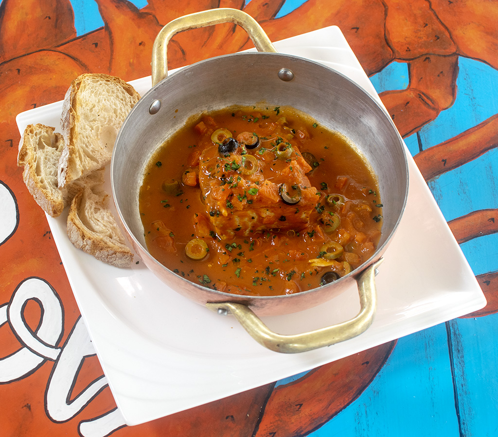 fish steak cooked in tomato sauté, capers and olives