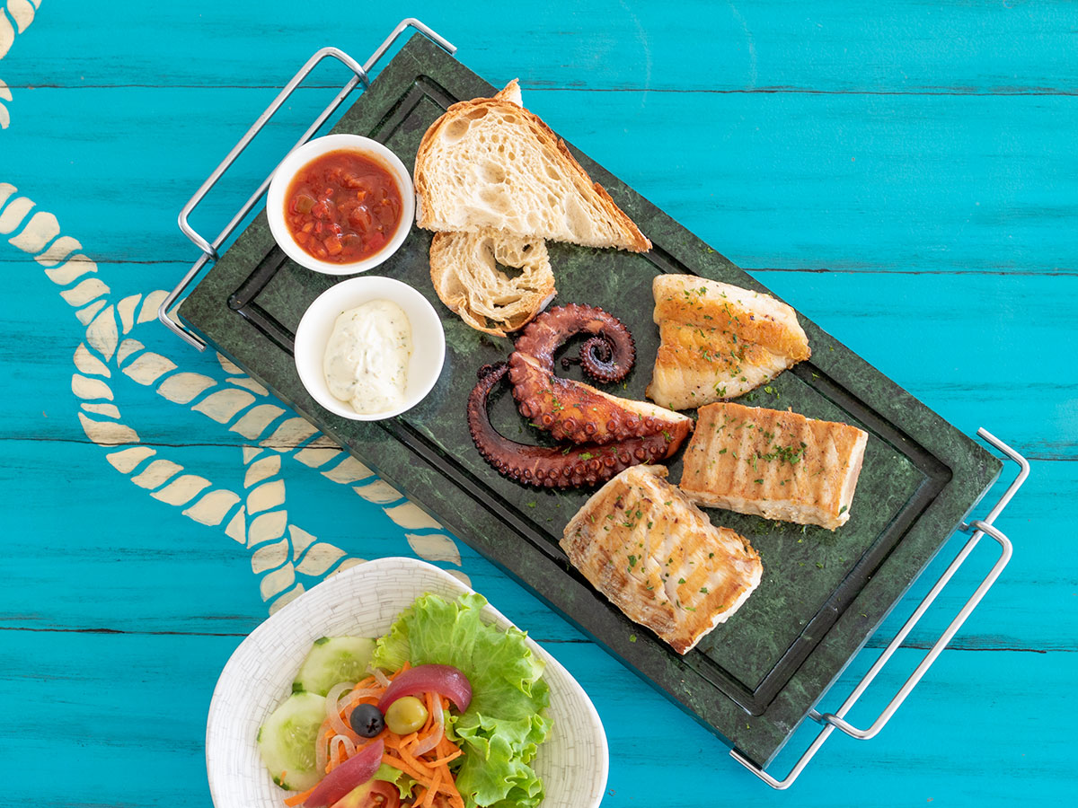 tasting of three different griddle fish fillets and an octopus tentacle, with criola and LobStar sauces, served with balsamic salad